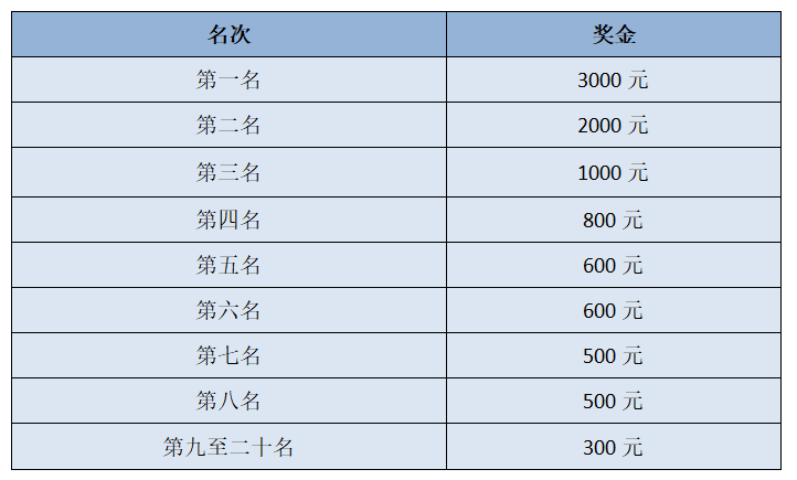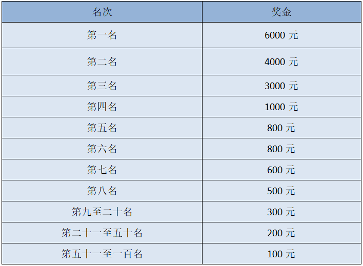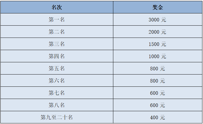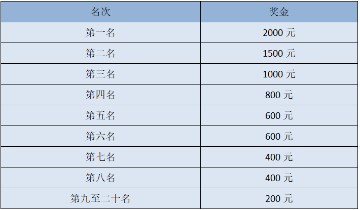 三、获奖者名单将于赛后一周内在官网上公布,公示10天后,如无疑义,将按获奖选手留给组委会的联系方式,通知选手办理领奖事宜,按规定程序支付奖金。
