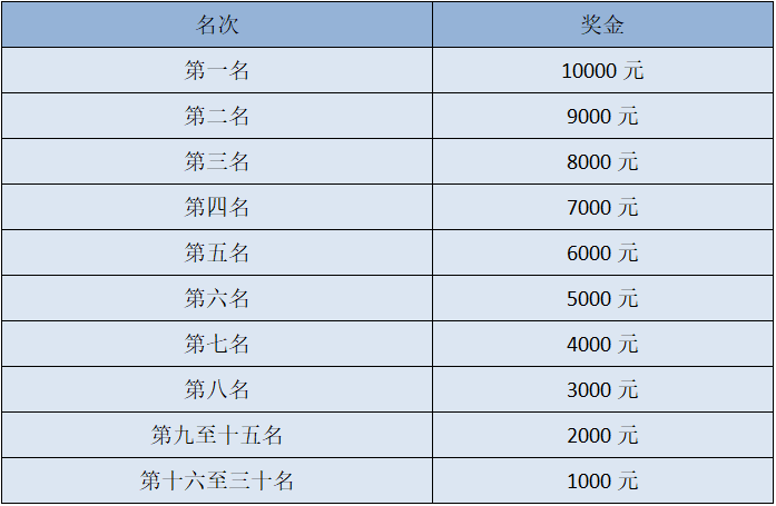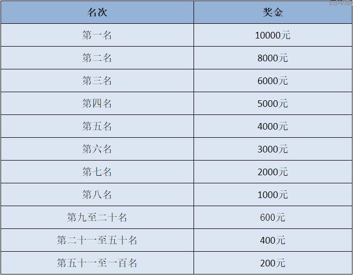 1、总成绩:男、女分别录取、奖励前一百名选手,其中前八名(按枪声成绩),分别获得奖金,前三名运动员另获奖杯一座,九至一百名按净计时排名。(奖金额见下表,单位:人民币,税前)