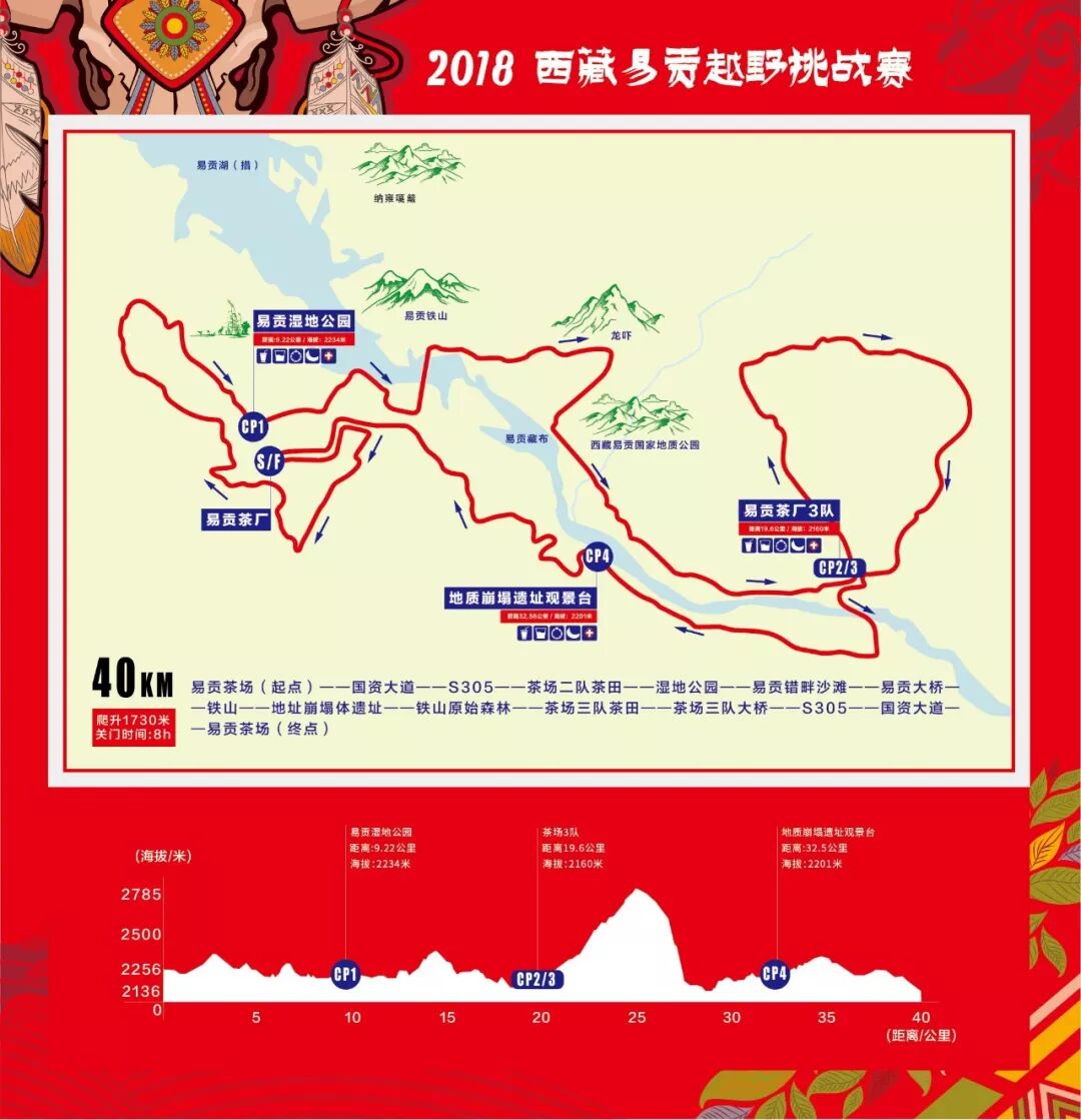(1)40公里越野赛线路涵盖易贡湖、易贡湿地公园、地质崩塌遗址、雪山,累计爬升1730米+;主要经过易贡湖边、茶田、湿地公园、易贡错畔沙滩、易贡大桥、铁山、地址崩塌体遗址、铁山原始森林;
