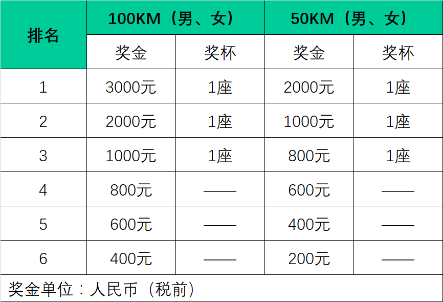 1、个人100公里组、个人50公里组比赛奖励取男、女子各前6名,为其颁发奖金与奖品。