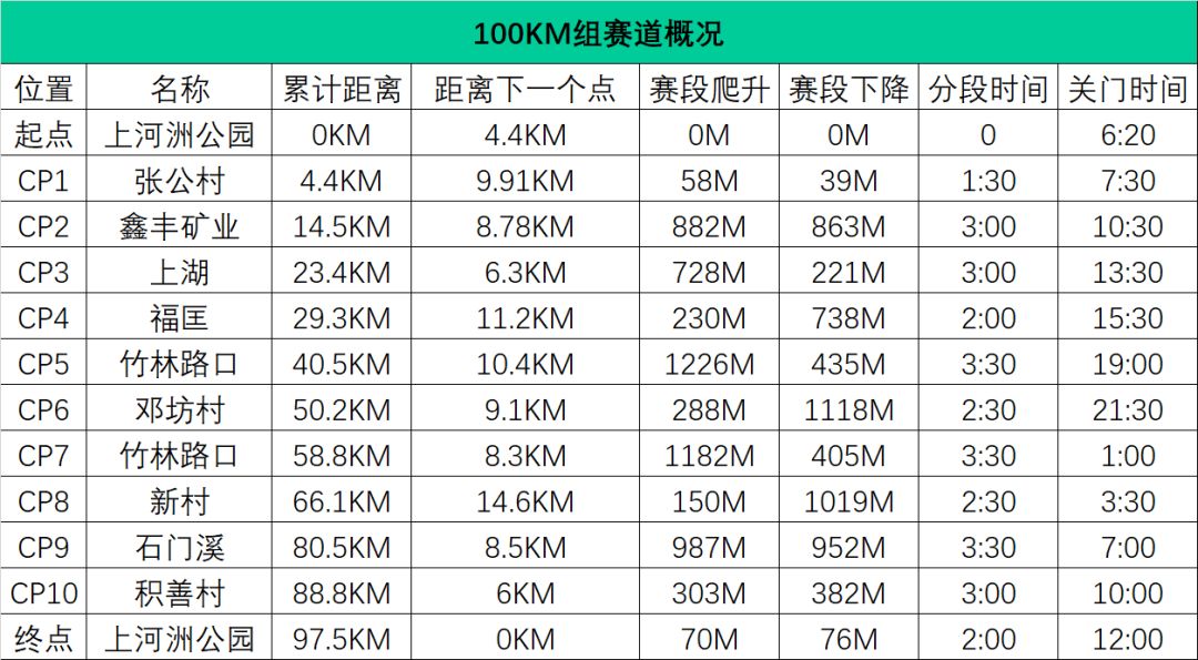 100公里组比赛起终点设在将乐县上河洲公园,全程约97.5公里,线路总爬升约6104米,下降高度6249米,其中硬化铺装路面不超过15%,其余赛道为山地、机耕道、丛林等地貌,赛道沿途共设10个补给站及检查打卡点,其中第6个补给站为换装点。