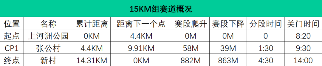 15公里组比赛起点设在将乐县上河洲公园,终点设在新村,全程约14.3公里,线路总爬升约940米,下降高度902米,其中硬化铺装路面不超过30%,其余赛道为山地、高山、机耕道、丛林等地貌,赛道沿途共设1个补给站及检查打卡点。