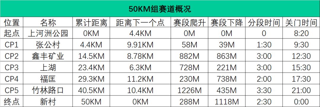 50公里组比赛起点设在将乐县上河洲公园,终点设在新村,全程约50公里,线路总爬升约3412米,下降高度3414米,其中硬化铺装路面不超过10%,其余赛道为山地、高山、机耕道、丛林等地貌,赛道沿途共设5个补给站及检查打卡点。