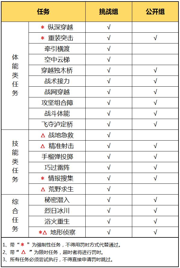 2、针对部分专业性较强的任务,组委会将开设赛前训练营,详情请关注公众号【全民军体赛】后续发布。