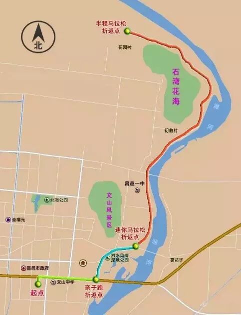 迷你马拉松:昌邑市文化广场(出发点)沿平安街向东→滨河西路向北→交通街大桥西首(折返点)折返,原路返回终点;